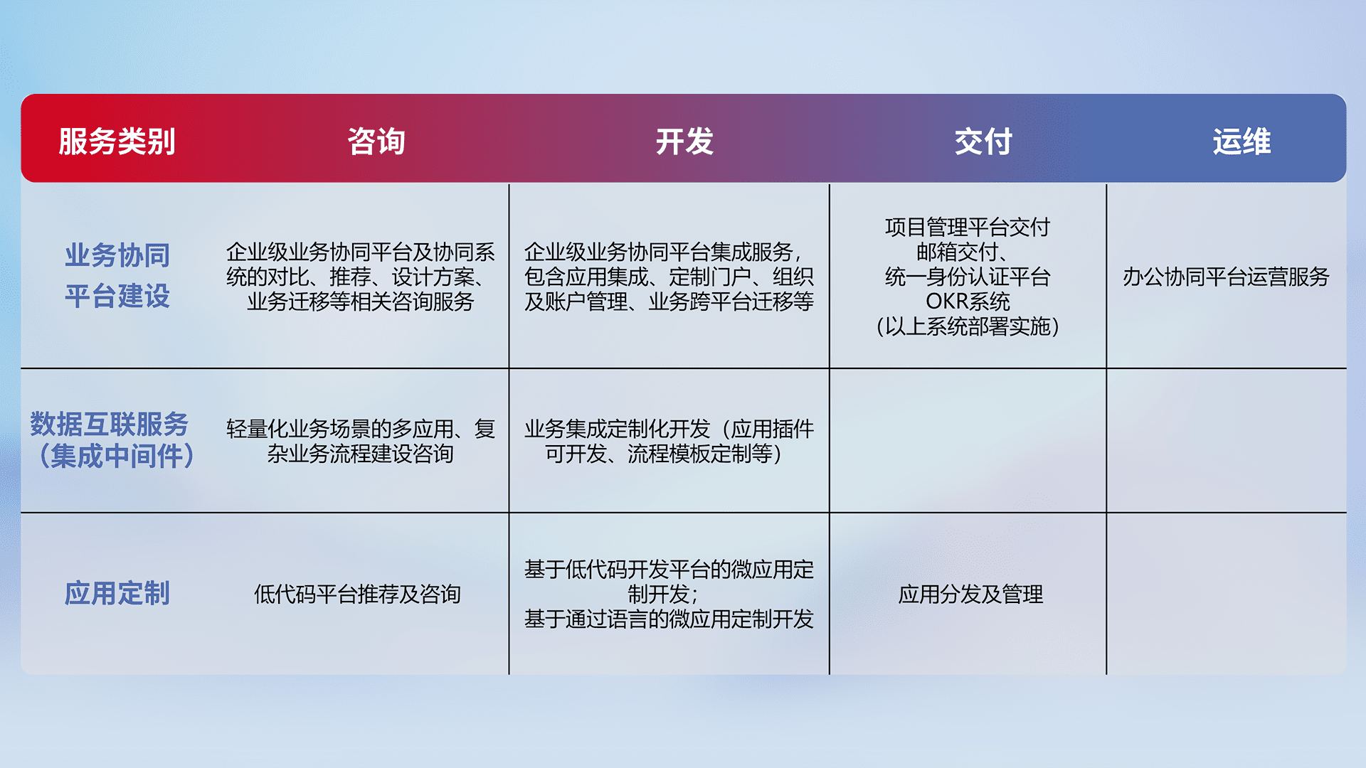 针对钉钉、、、、企微、、IDaas等平台级产品提供产品的规划、、、、方案、、、交付、、、定制化开发等服务,,实现如统一协同办公、、、智能客户服务、、混合会议管理、、、智能数据查询、、、等业务场景,,实现数字化转型。。。