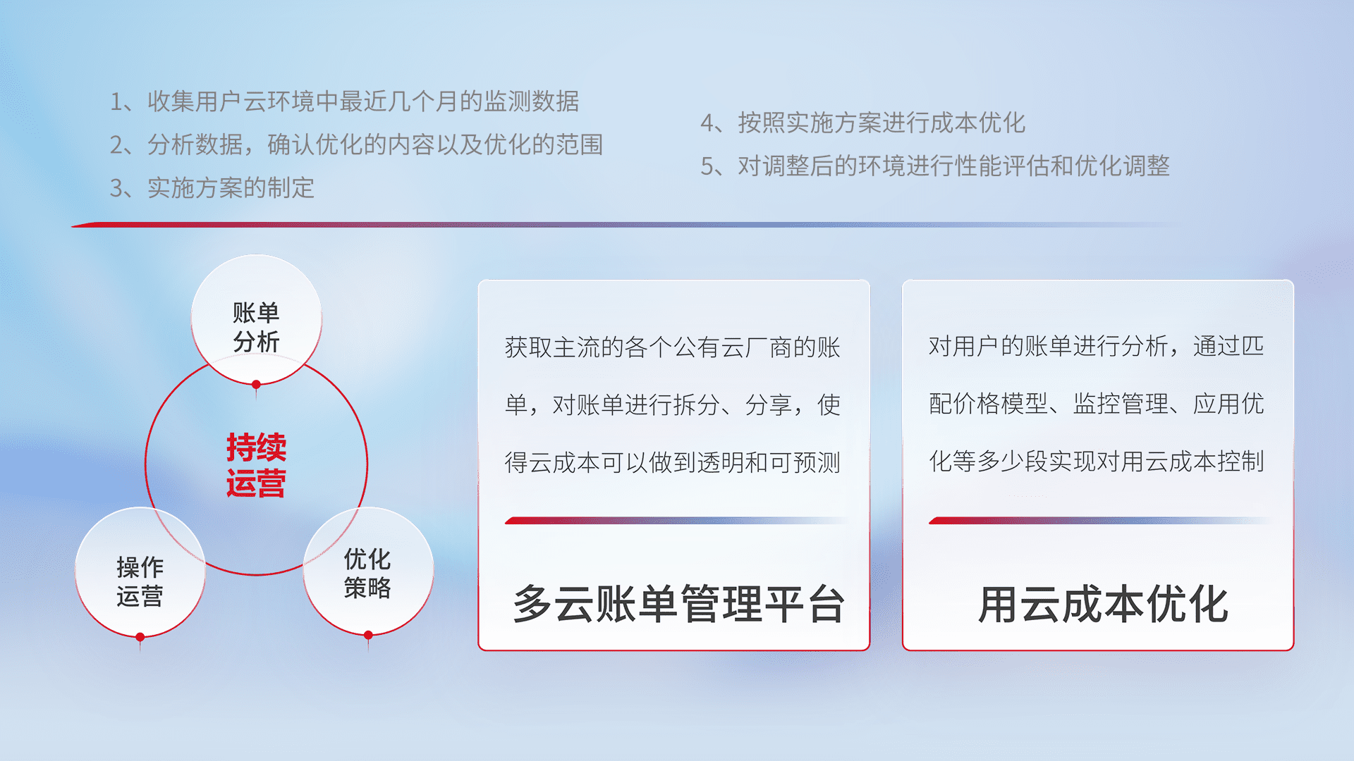 通过多云纳管,,,以统一的资源数据模型把客户的云资源进行抽象和封装,,进而实现对多云资源的统一操作,,,保障云资源管理的可靠性、、、稳定性与可用性。。。量身定制化运维内容,,配置、、开发运维、、补丁管理、、、、备份、、监控、、认证和访问管理、、、审计和日常巡检等,,,保障在用云过程中的可靠度,,,,稳定度以及高可用率。。。。